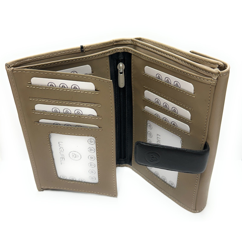 Billetero confeccionado en piel con doble billetero con cremallera interior en la parte del billetero, dos departamentos para billletes, un talco para fotos y doce ranuras para tarjetas.